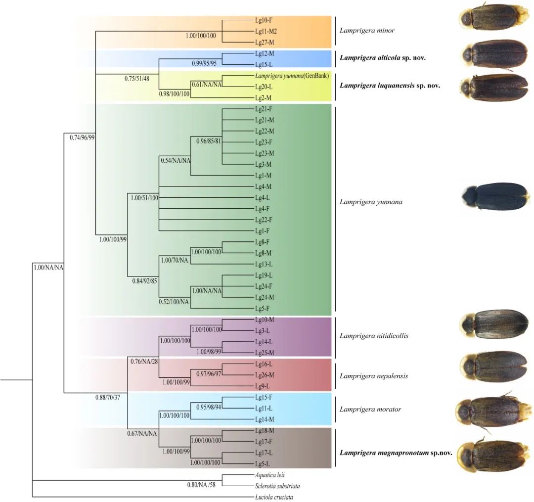 基於長期的標本積累,藉助DNA barcoding技術,研究團隊通過對中國不同種羣的標本進行了分子系統發育和形態分析,並與香港同行檢視的模式標本進行形態比較,驚奇地發現這些看似都一樣的扁螢標本中包括三個新種(Lamprigera alticola Dong & Li, 2021高山扁螢, Lamprigera luquanensis Dong & Li, 2021祿勸扁螢,Lamprigera magnapronotum Dong & Li, 2021巨胸扁螢)、四個中國新記錄種(Lamprigera minor (Olivier, 1885)小扁螢、Lamprigera morator (Olivier, 1891)扇窗扁螢、Lamprigera nepalensis (Hope, 1831)尼泊爾扁螢、Lamprigera nitidicollis (Fairmaire, 1891)光亮扁螢)和一箇中國已報道種類(Lamprigera yunnana (Fairmaire, 1897)雲南扁螢) (Dong etal., Zootaxa, 2021, 4950(3): 441–468)。