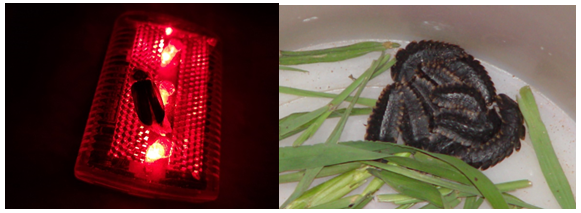 左圖為紅燈誘集扁螢雄蟲,右圖為聚集在一起的雲南扁螢幼蟲(李學燕 攝)