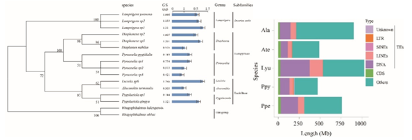 扁螢具有較大的基因組,左圖為流式技術測定C值(Liu et al., 2017),右圖為對基因組重複序列分析結果(Zhang et al., 2020)。