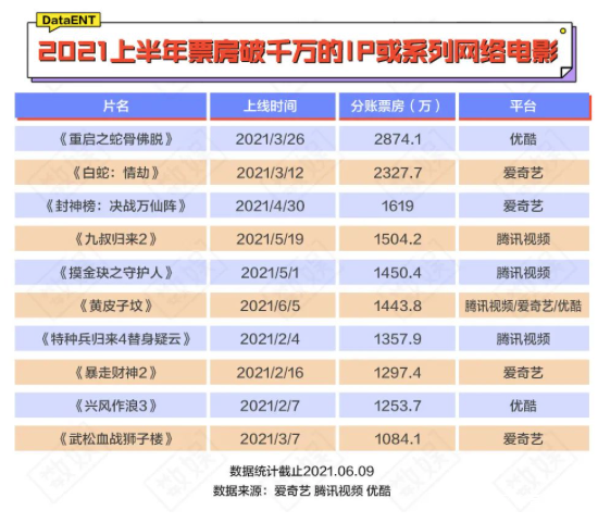 根據雲合數據後台及各大平台自身的數據統計顯示,截至6月9日,2021上半年上線的網絡電影共有264部,票房過千萬的影片僅28部,而去年上半年,全網共上線網絡電影391部,37部票房破千萬。