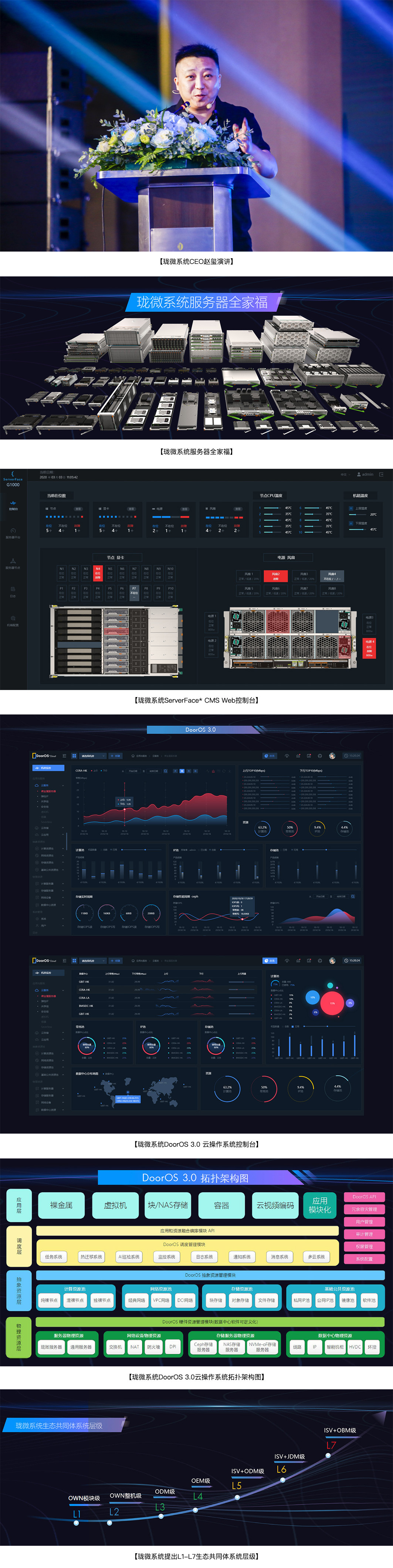 本次發佈會上,瓏微系統還展出了公司ServerFace裸金屬卡及服務器平台,包括:M7260六節點分佈式混合存儲服務器、G1000十節點高密度模塊化GPU服務器平台、N6000超高密度混合系統平台、E1000全模塊化融合邊緣服務器、C1000高密度全模塊化混合刀片服務器、X8000全場景模塊化融合刀片服務器、以及FitaserverP2500 V1、FitaserverR2280 V6等,同時在解決方案展區,展示了OneDesignCloud雲工作站解決方案、實景三維算力解決方案、IPFS行業解決方案/混合雲解決方案、一站式雲遊戲/雲渲染解決方案&裸金屬通用平台解決方案等。