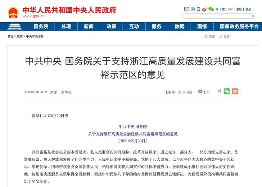 值得一提的是,**《關於支持浙江高質量發展建設共同富裕示範區的意見》近日公佈,**賦予了浙江重要示範改革任務,為全國推動共同富裕提供省域範例。