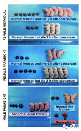 不過,在一對妊娠的異時共生體老鼠裏,只有雄性出現了死胎現象,推斷可能是在胚胎髮育後期(胚胎期18日左右)發生了異常。