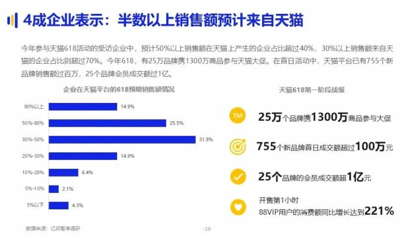 在億邦智庫的調查顯示,4成受訪企業今年618半數以上銷售額預計來自天貓。