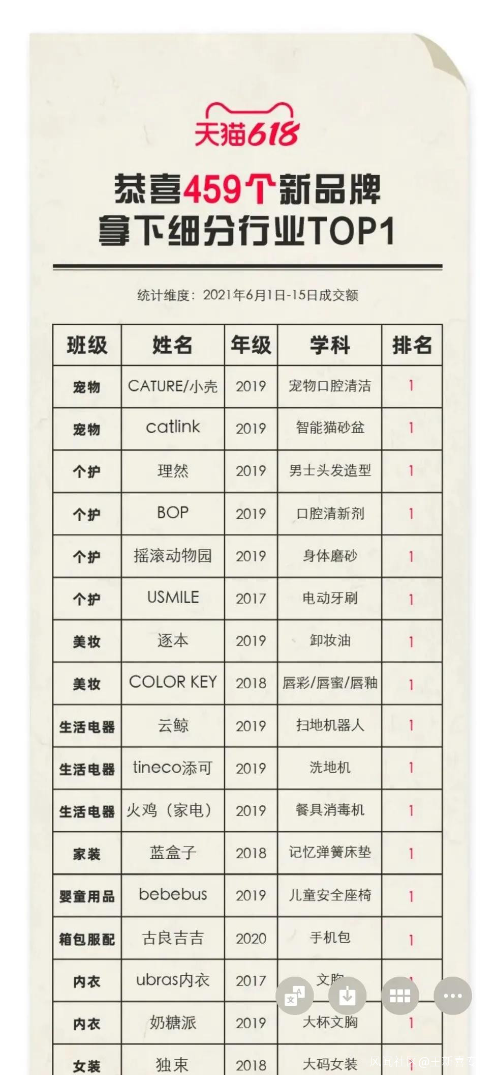 日前,不少新品牌第一次參加天貓618就表現不俗,例如素肌良品奪得軟支撐內衣第一,三隻松鼠旗下嬰童食品新品牌“小鹿藍藍”,位列寶寶零食類目第一,主營漱口水、口腔噴霧的新品牌BOP也成為細分品類第一。