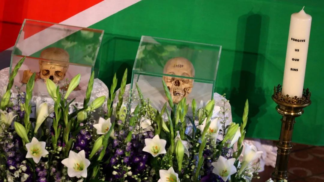 ▲2018年8月,德國柏林一所教堂內的交接儀式上,當年被德軍帶回的赫雷羅人和納馬人頭骨被置於玻璃櫃中展示。