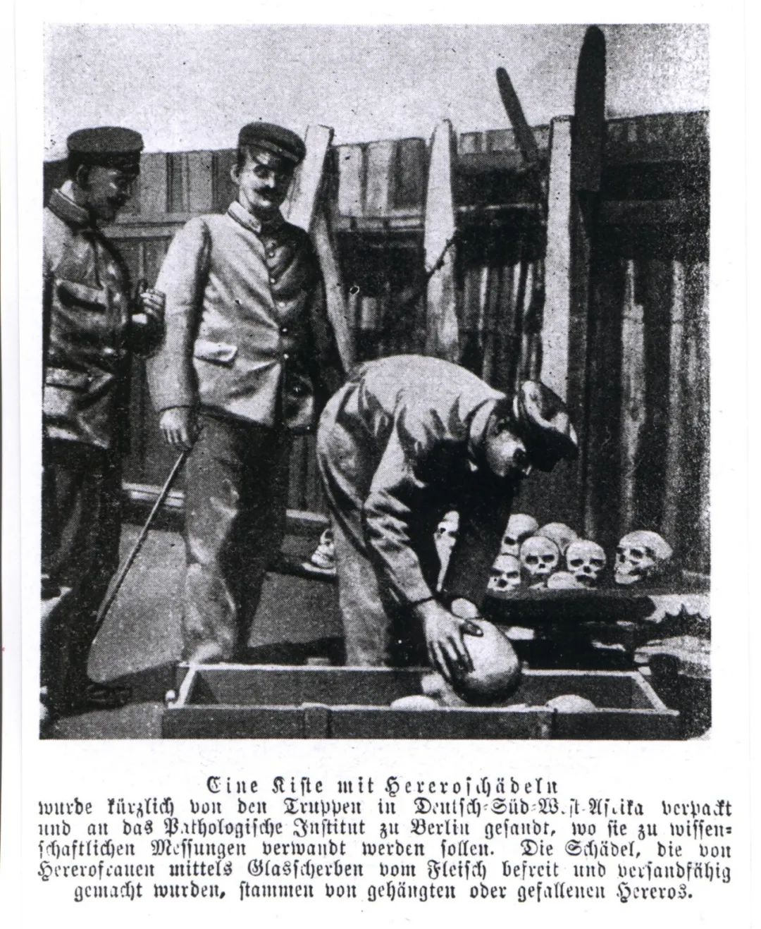 ▲一張當年駐納米比亞德軍的明信片,上書:一件帶有赫雷羅人頭骨的箱子將於近期由軍隊打包送至柏林病理學研究所,以供科學研究。這些頭骨部分來源於被吊死的赫雷羅人,由赫雷羅婦女用玻璃片剔除血肉以便於運輸。