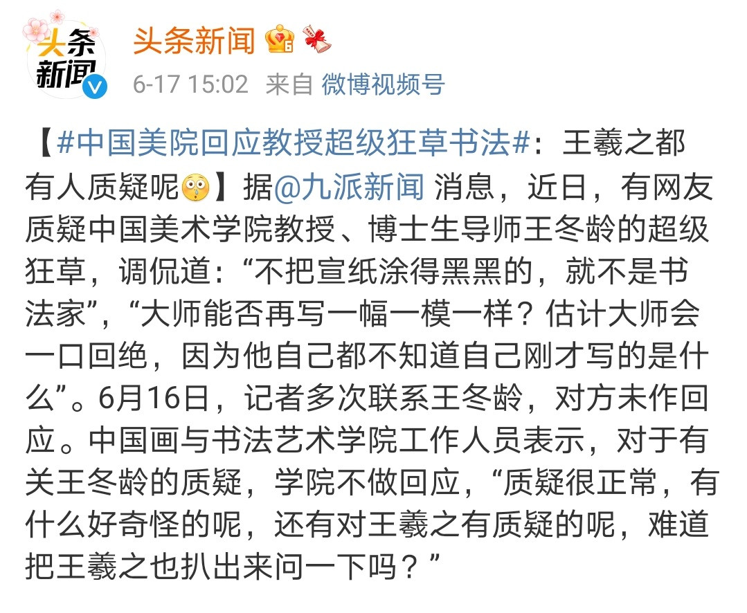 讓我沒想到的是,如此無下限的事情,仍然有人洗地、以藝術之名為當事人辯解。然後我又看到中國美術學院工作人員對於該校教授的“超級狂草”派書法做出的回應:“質疑很正常,有什麼好奇怪的呢,還有對王羲之有質疑的呢,難道把王羲之也扒出來問一下嗎?”