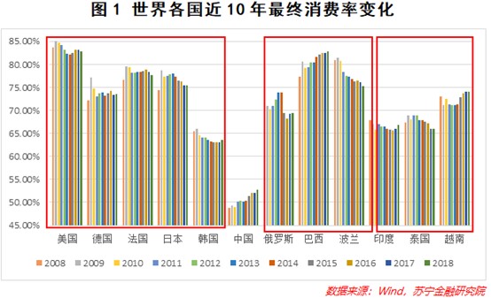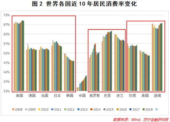 以圖1中所列國家為例,這些國家大概分為三類,美、日、韓等發達國家,俄羅斯、巴西、波蘭等與中國人均GDP相近的國家,印度、泰國、越南等與中國相鄰的新興市場國家。可以看到,不論是相比於高水平的發達國家,還是同等人均GDP發展水平的國家,或是文化地緣相近的鄰國,我國的最終消費率都非常低,且相比於同等人均GDP國家,要低25個百分點左右。