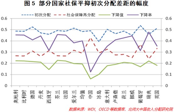 以社會保障為例,在北師大收入分配研究院2017年針對收入再分配製度的研究中,18個歐盟國家市場收入的基尼係數為0.443,在社會保障的作用下,這些國家的可支配收入基尼係數降為0.29。從下降幅度來看,歐盟國家政府的社會保障政策使得其基尼係數的平均值下降了40%,相比之下,中國僅下降了12.3%。