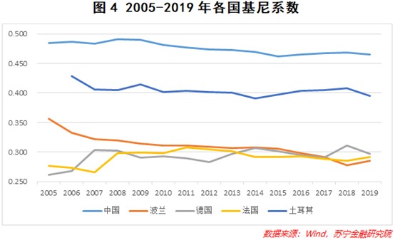 從上圖數據來看,中國反映收入差距的基尼係數雖然近些年有所降低,但仍然要大幅高於其他國家。