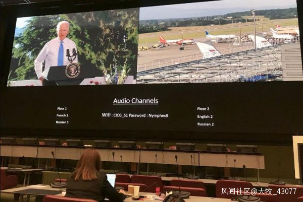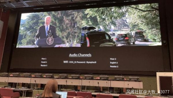 △16日傍晚,日內瓦俄美峯會新聞中心大屏幕直播拜登記者會