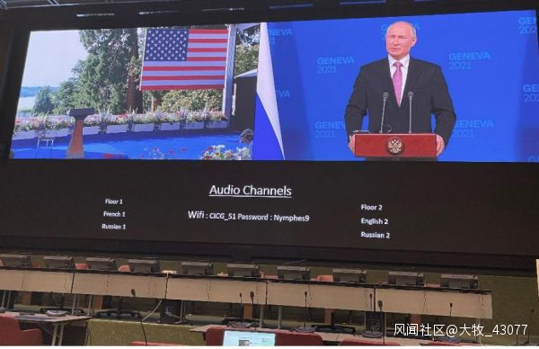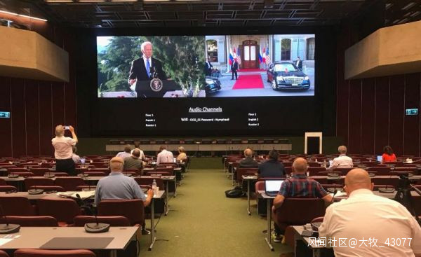 △16日傍晚,日內瓦俄美峯會新聞中心大屏幕直播普京新聞發佈會