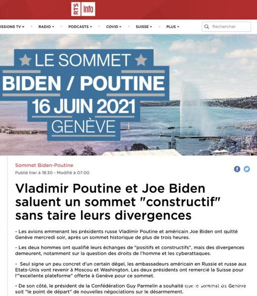 瑞士法語廣播電視台在會後報道中指出,普京與拜登歡迎“建設性”峯會,但未消除分歧。“雙方將彼此的交流描述為‘積極和有建設性的’,但分歧仍然存在,特別是在人權和網絡安全問題上。”