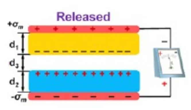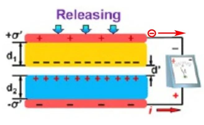 當外界壓力被釋放的時候,兩者分開,為了保持各自電中性,小黃會將電子通過外電路傳輸給小藍,形成前半週期的電流。