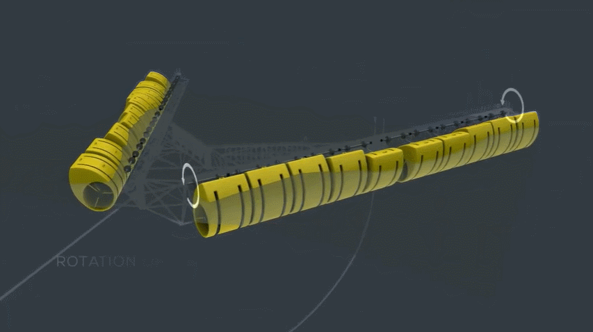 WEPTOS的整體形狀像一個大型的鑷子,兩條長達8米的大長腿上分別安裝着10個轉子。隨着波浪的起伏,這些轉子會不停地擺動。