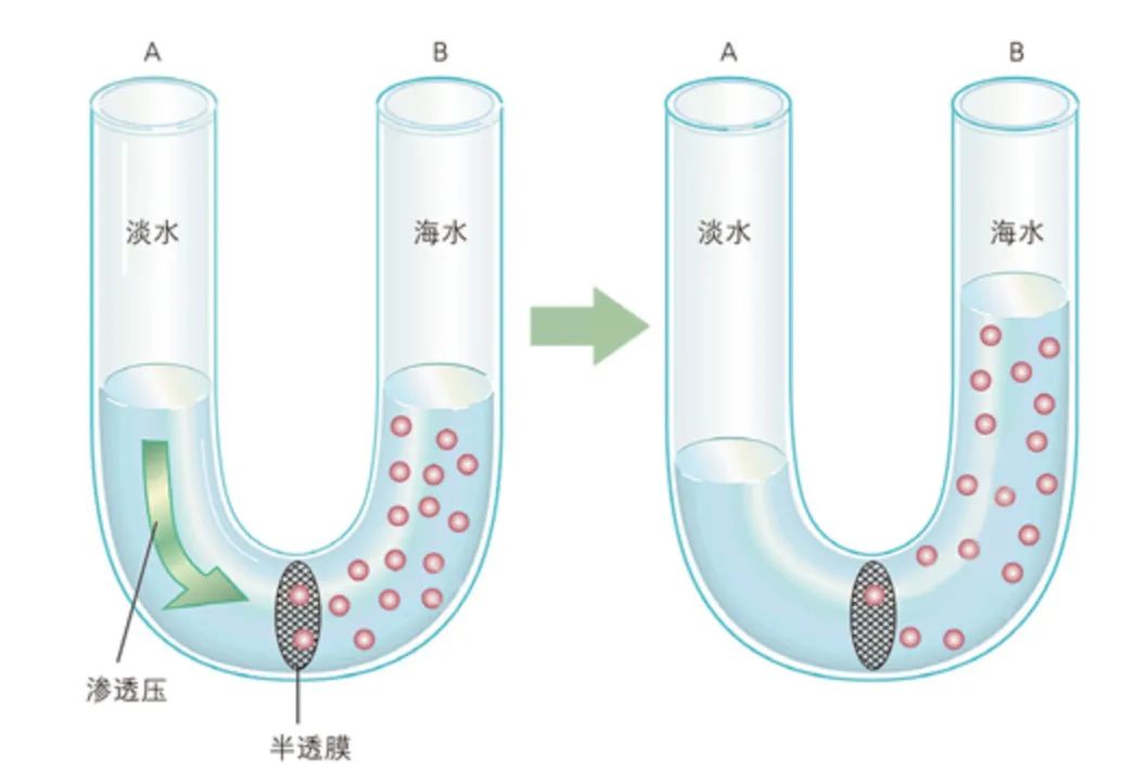 我們可以利用大海與陸地河口交界水域的鹽度差,一種最常見的方式就是在淡水和鹽水的交界處放置一個半透膜,阻礙鹽類離子的通過,這樣就會迫使稀溶液中的水分子單向地朝濃溶液中擴散,那麼濃溶液一側的水位就會上升,化學勢能轉化為重力勢能,利用這個水位差就可以推動水輪發電機發電。
