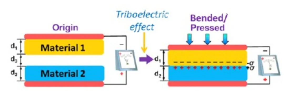 採用兩種材料 (小黃和小藍),當有外界壓力導致兩者被壓在一起時,小黃會得到電子,小藍失去電子。