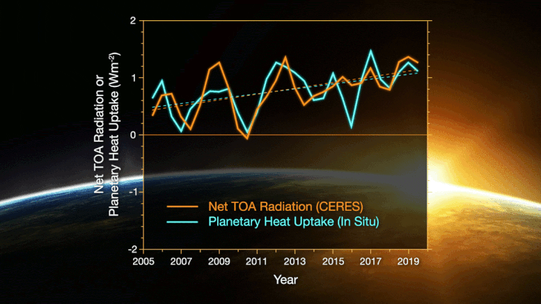 NASA和NOAA的科學家從NASA的雲和地球輻射能監測系統(CERES)的衞星傳感器中發現,進入和離開地球之間的能量失衡正在快速發生,另外一個來自名為Argo的全球海洋附表陣列的數據表明,大約有90%的不平衡能量最終進入了海洋!
