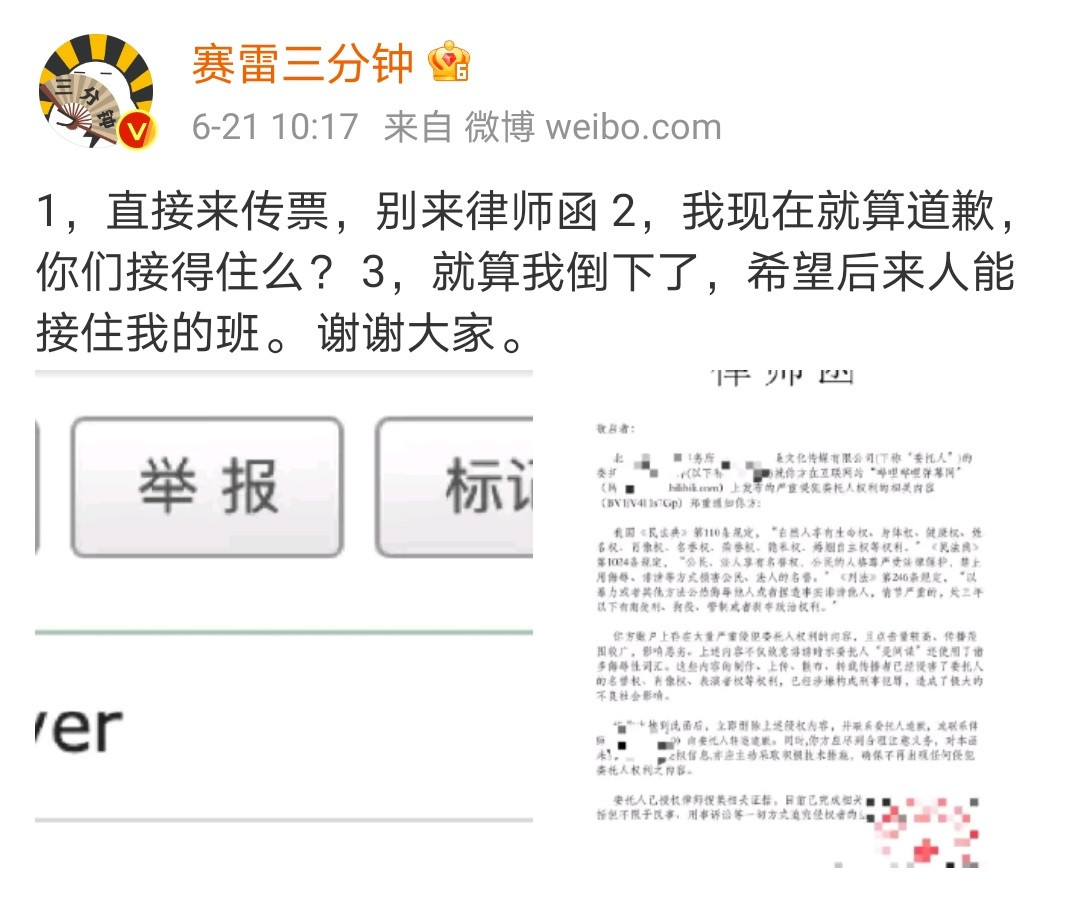 該律師函提到,“賽雷三分鐘”創作的視頻侵犯了委託人的合法權益。