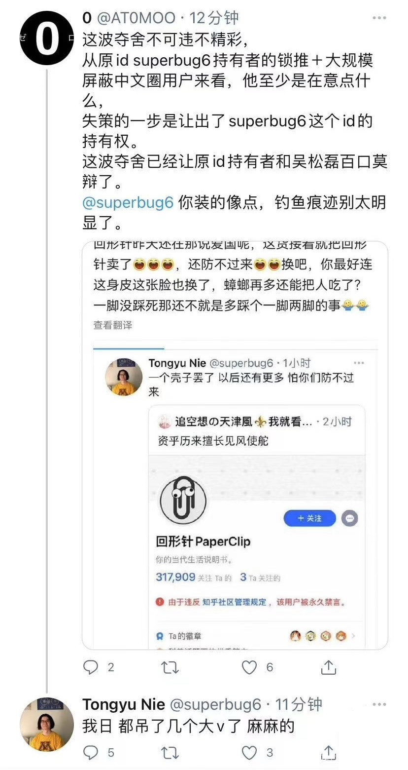 ID為@superbug6、暱稱與“回形針”前員工一致的推特用户發表“以後還有更多,怕你們防不過來”的言論。