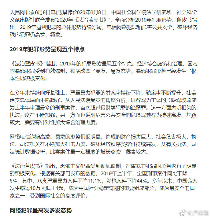 我查了一下,我國犯罪率尤其刑事犯罪率從2012年以來,一直在降低。不管是之前的公安部講話還是2020年法治藍皮書都印證了這一點。