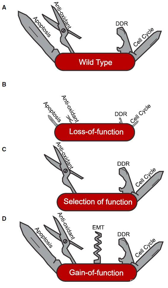 不同機制可導致p53突變的不同表型:(A)野生型,(B)功能喪失或部分喪失,(C)功能選擇,(D)新形態/功能增益