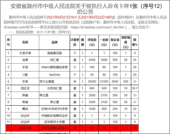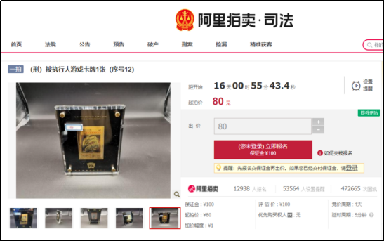 滁州中院在阿里拍賣掛出“被執行人遊戲卡牌1張”,底價80元,估價100元。