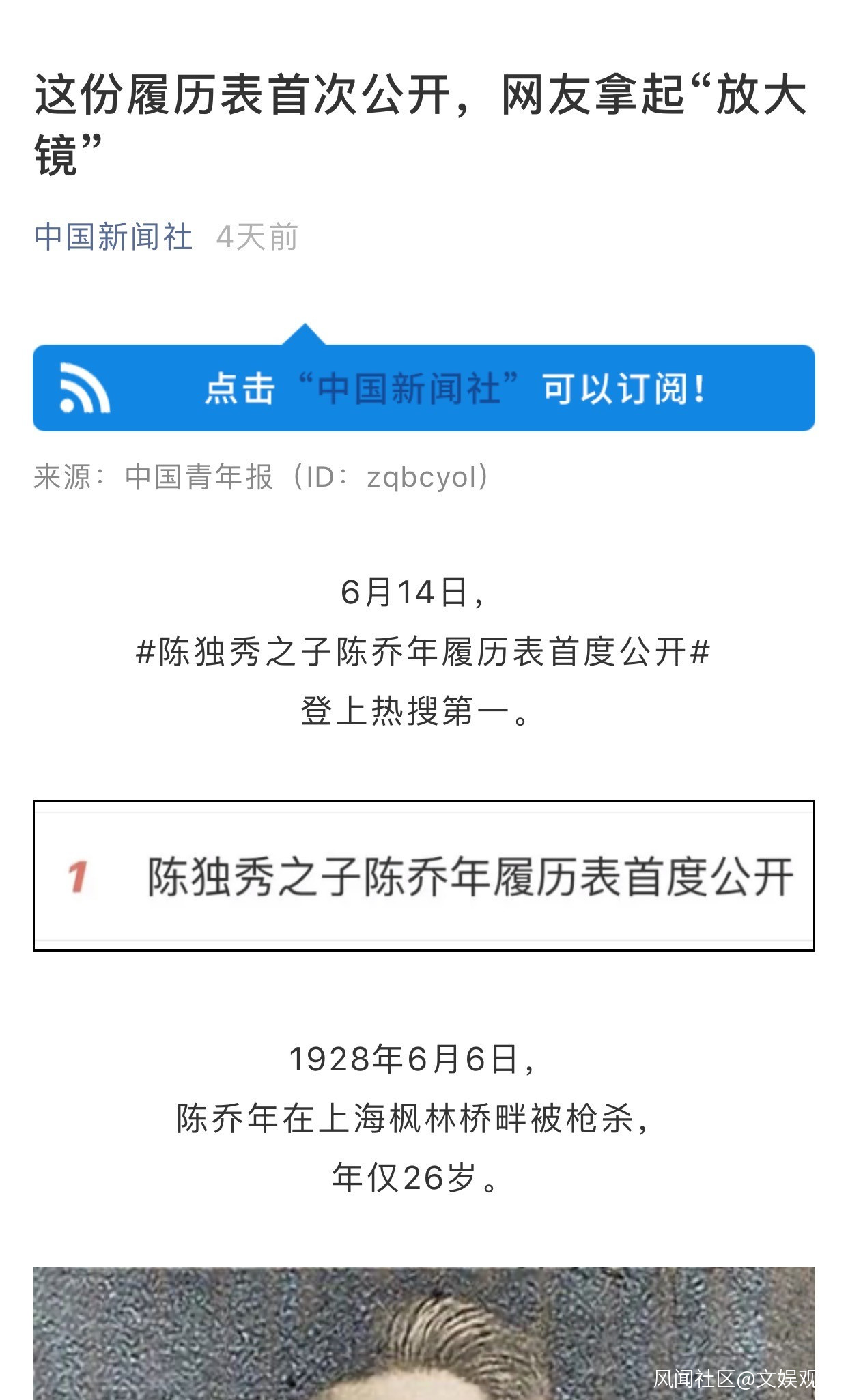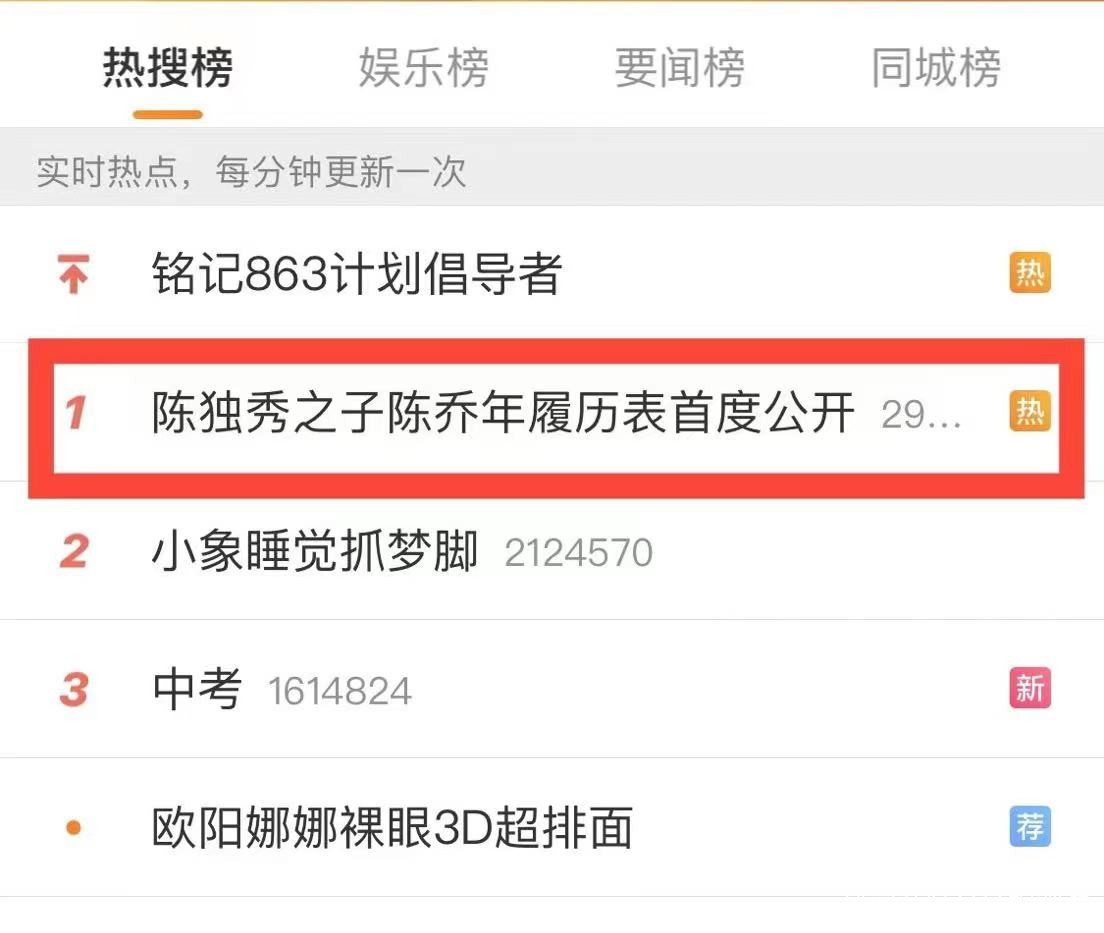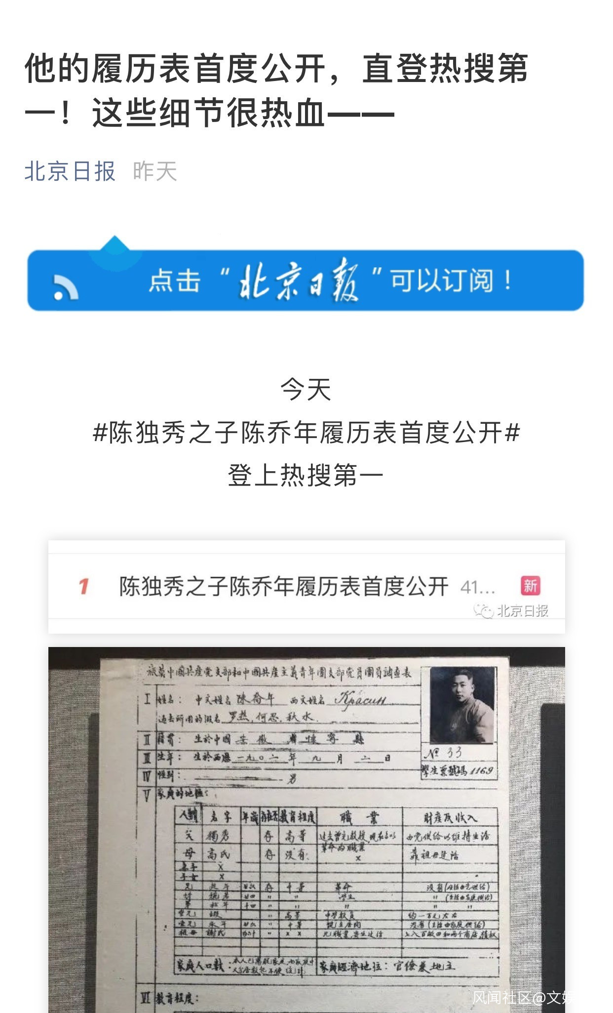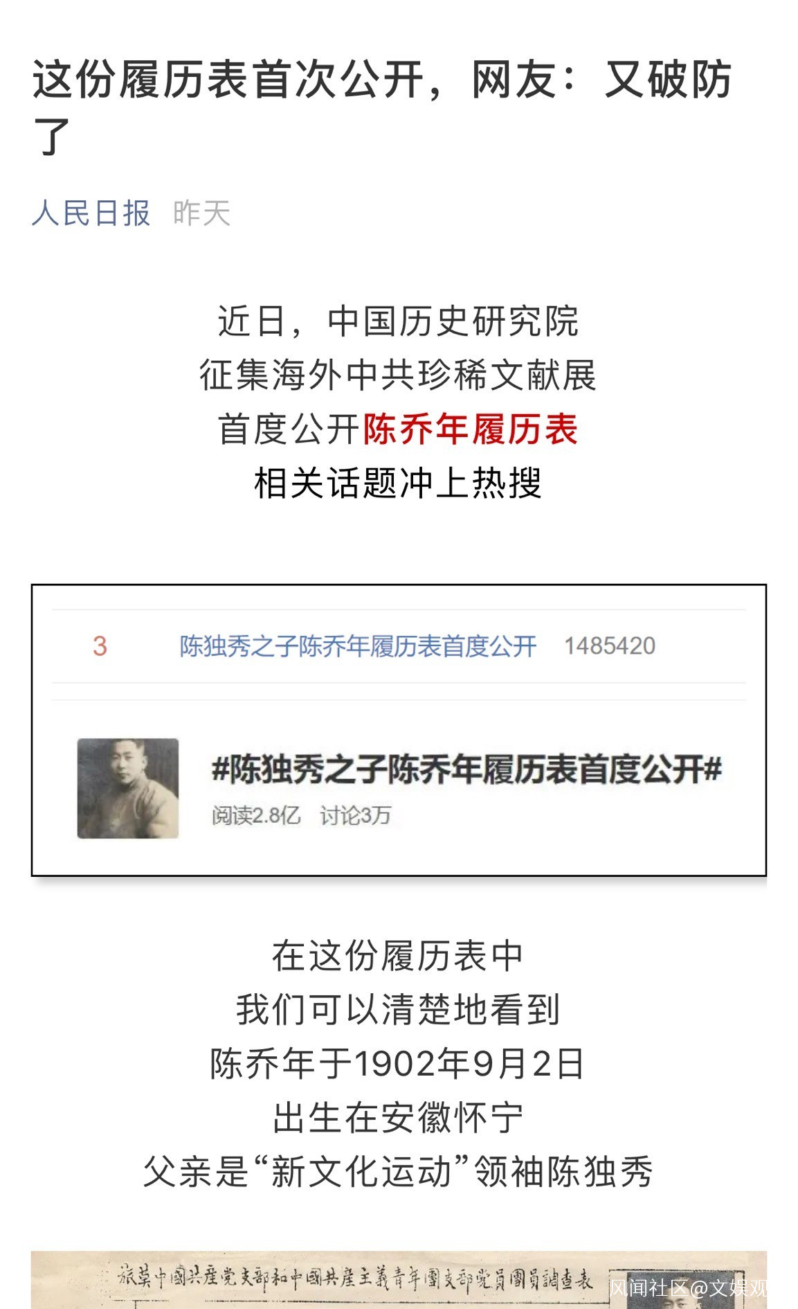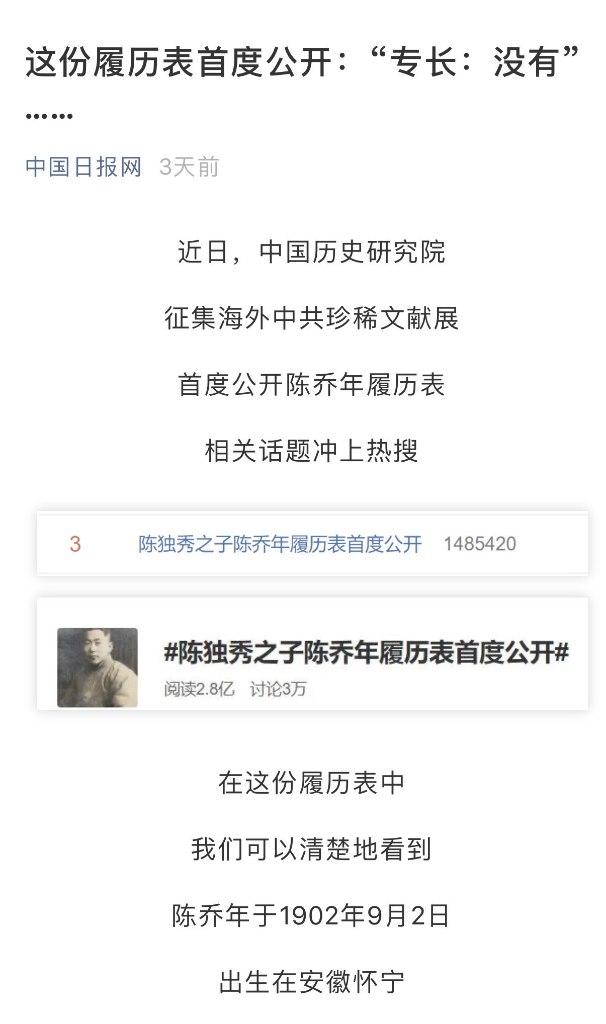 據瞭解,6月11日《國家記憶》微博號就發佈了以“陳獨秀之子陳喬年履歷表首度公開”為主題詞的圖文。6月14日,在《人民的選擇》開播當天進行宣推預熱,並登上微博熱搜榜第一名,閲讀量達5.7億,討論量5萬,加大了《人民的選擇》開播的影響力。
