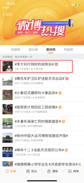 話題#李大釗行刑時的絞刑台#短時間內就達到3.7億,同時登上熱搜總榜和要聞榜首位,相關視頻卡段播放量累計超過1674萬次,話題相關視頻登上了微博視頻熱榜第3名,真正實現熱度出圈。