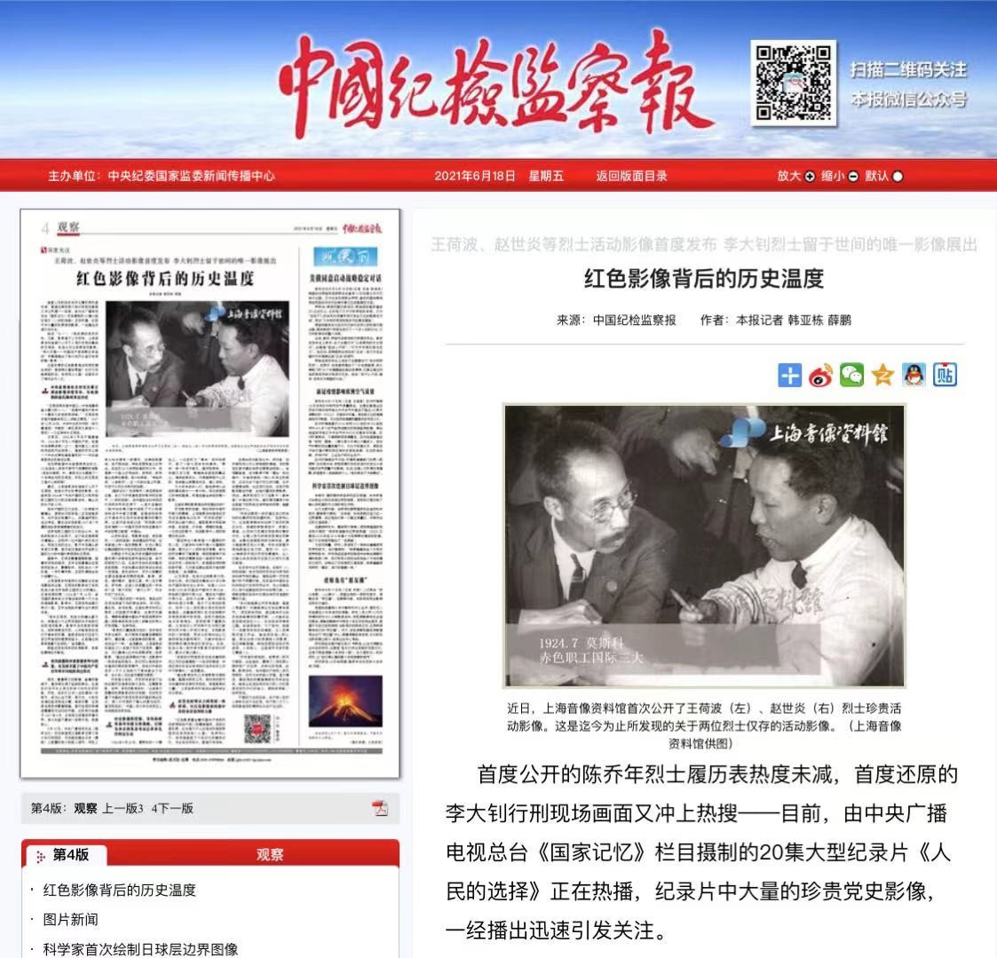 2021年6月18日出版的《中國紀檢監察報》點贊紀錄片《人民的選擇》。報道在開篇中表示:“首度公開的陳喬年烈士履歷表熱度未減,首度還原的李大釗行刑現場畫面又衝上熱搜——目前,由中央廣播電視總枱《國家記憶》欄目攝製的20集大型紀錄片《人民的選擇》正在熱播,紀錄片中大量的珍貴黨史影像,一經播出迅速引發關注。”