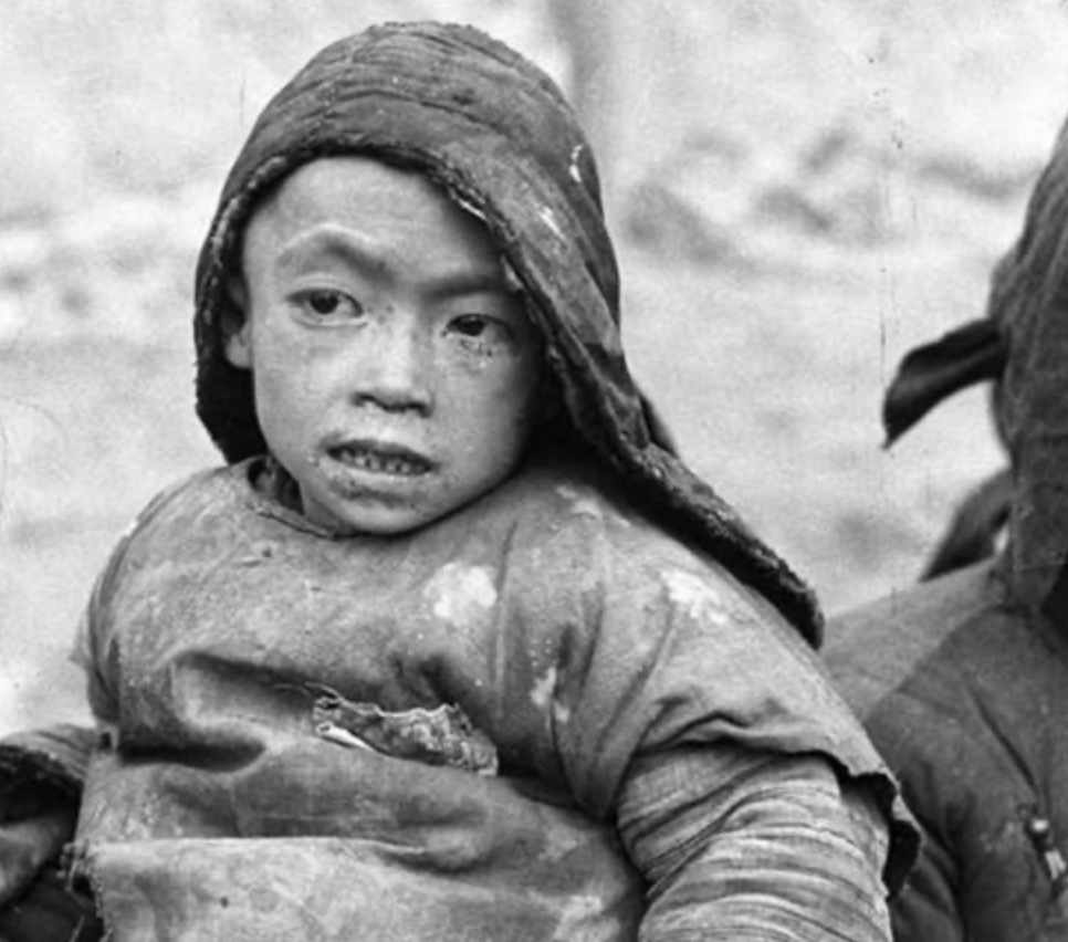 這些瘦到不像樣的人,應該是眼睛的地方,卻是充滿着膿水的窟窿。營養不足使他們的頭髮乾枯;飢餓弄得他們的肚子鼓脹起來天氣吹裂了他們的皮。