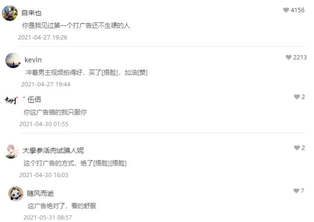 羽錚發佈以優質內容為載體的廣告,粉絲在評論區較為活躍。不少粉絲稱讚廣告在視頻裏的展現方式,並願意為之買單,更有粉絲就羽錚本人的表現,進行下單消費。可見,商品不再是唯一的、理性的決策因素,消費者也可以被感染,從而進行感性決策。