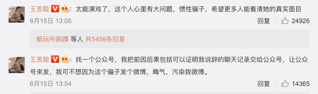 為了讓孫一寧感到威脅,王思聰又用自己的微博賬號到她的微博評論區留言同樣的話,引來很多網友去搜她當年的黑料。