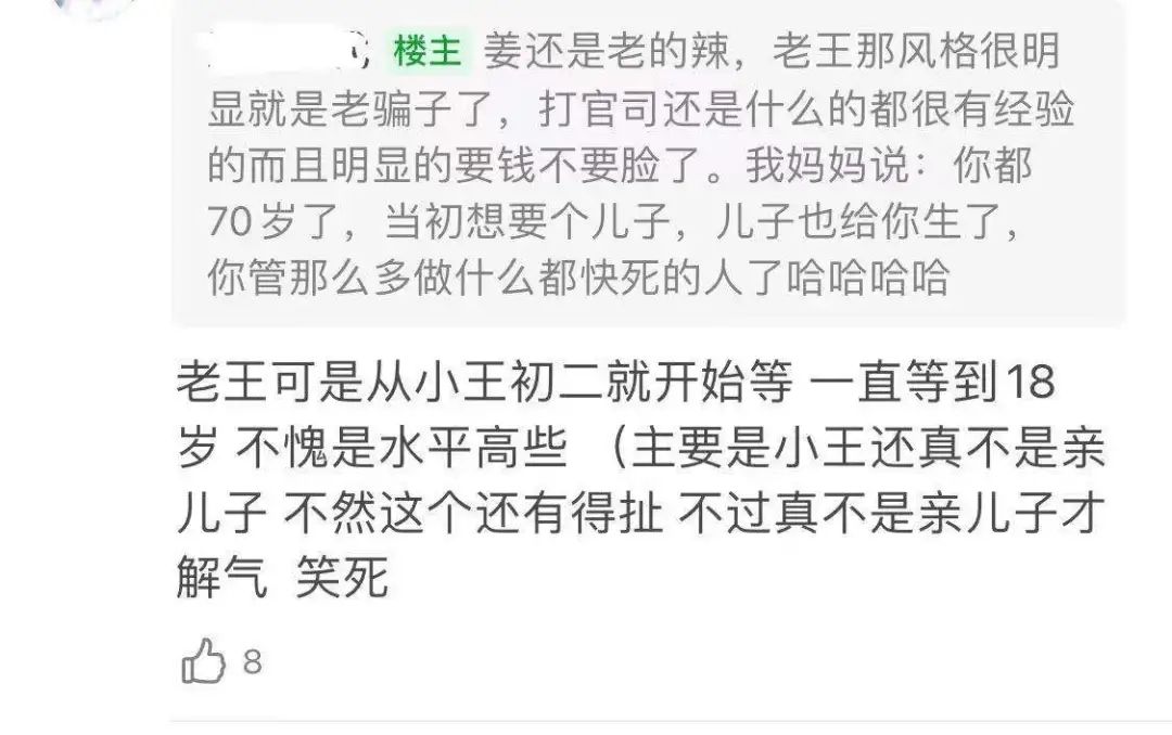 小王:感覺他已經知道老王不是自己親爹,但是還是想要房子錢於是和老王打官司,法院要求他再做一次dna鑑定,但是他説他要面子不做。