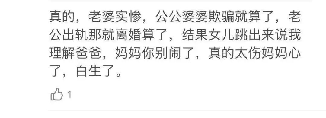 老王老婆:就是可憐,五、六十歲了發現老公出軌還是想着不要再受委屈要離婚,結果女兒跳出來説理解爸爸,説媽媽年紀大了讓媽媽別鬧了,勸媽媽接受不要離婚。