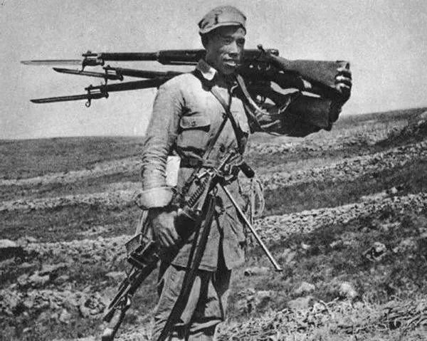 ▲八路軍戰士肩扛繳獲的日軍“三八大蓋”