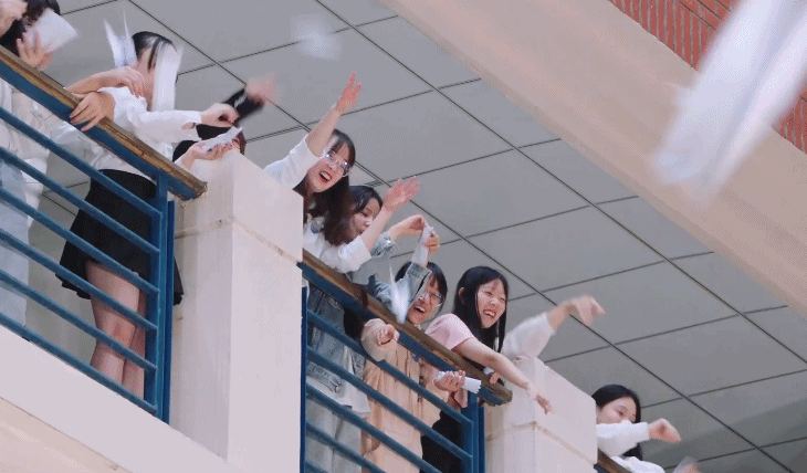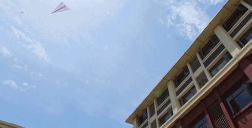 一曲終罷,同學們站在教學樓上,放飛了紙飛機。