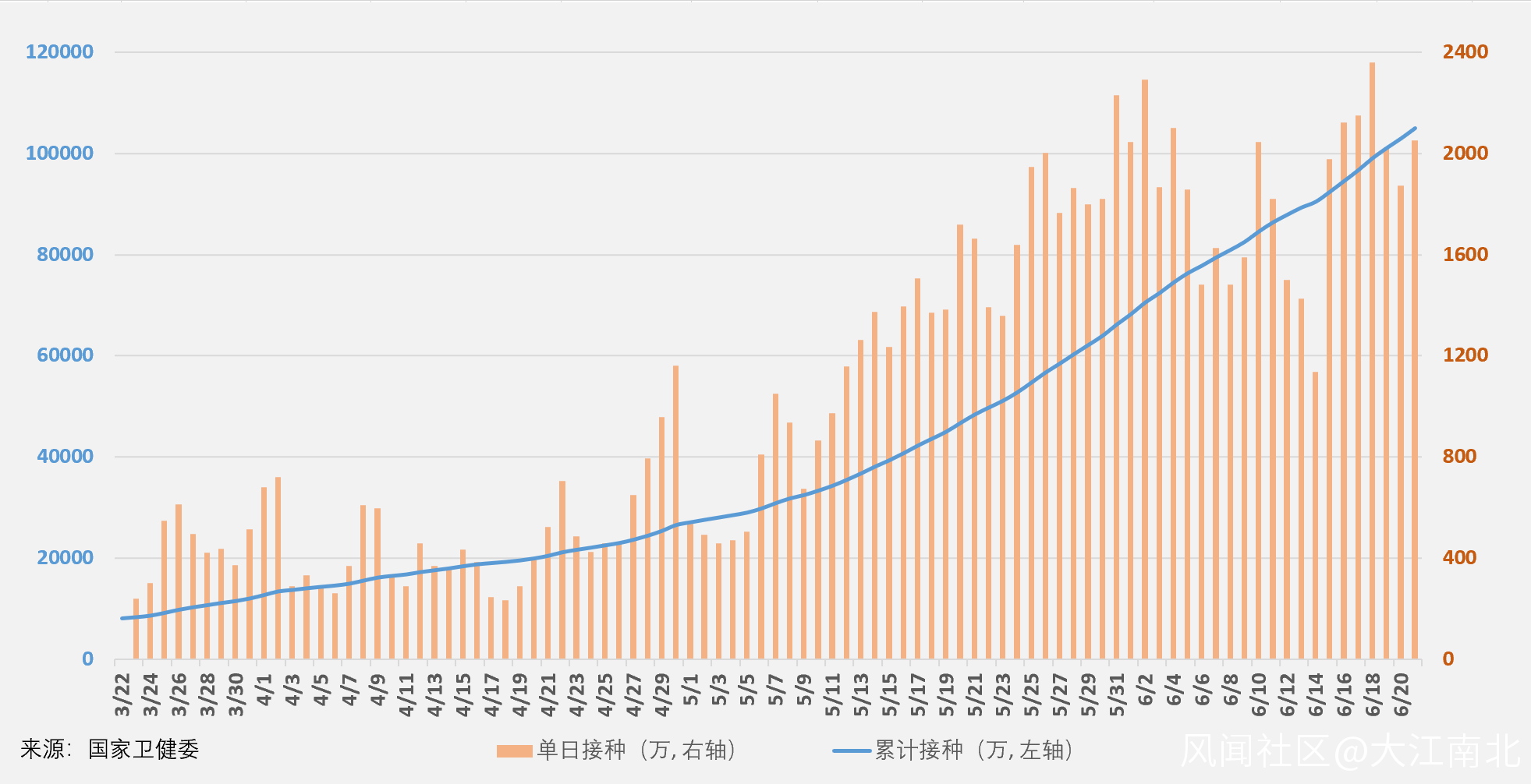 截止2021年6月22日,中國大陸累計接種新冠疫苗10.497億劑,繼續位居全球第一位,佔全球累計接種劑數的38.9%,環比增加0.3%;其中單日新增接種2052****萬劑,佔全球單日接種劑數的53.7%。我國自3月23日以來,日均接種1065萬劑。中國每百人累計接種72.92劑,環比增加1.42劑。