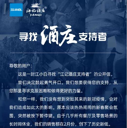 2020年2月,江小白的銷售額創下歷史新低,發文呼籲消費者購買產品。此後,江小白多項大型活動停辦,包括舉辦了四屆的街舞比賽、曾半年跑遍95座城市贈混飲的小酒館活動。