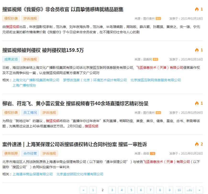 在天眼查APP上查詢有關搜狐視頻的輿情信息,選擇涉訴違規分類,可以看到有關信息達到31頁之多,暴風影音、百度、今日頭條等很多互聯網巨頭都曾被搜狐控訴,但搜狐視頻也曾被上海一家影視公司上訴侵權,賠了159.5萬。可見搜狐喊着“反盜版”,自己也做不到“冰清玉潔”。