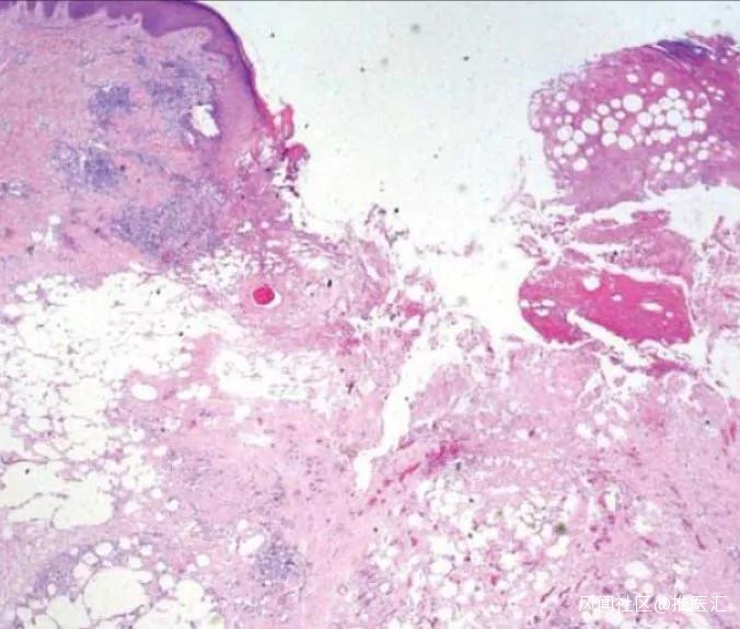 圖 3 組織學標本顯示錶皮和上部結締組織層形成廣泛壞死(蘇木精-伊紅染色,放大倍數 10×)