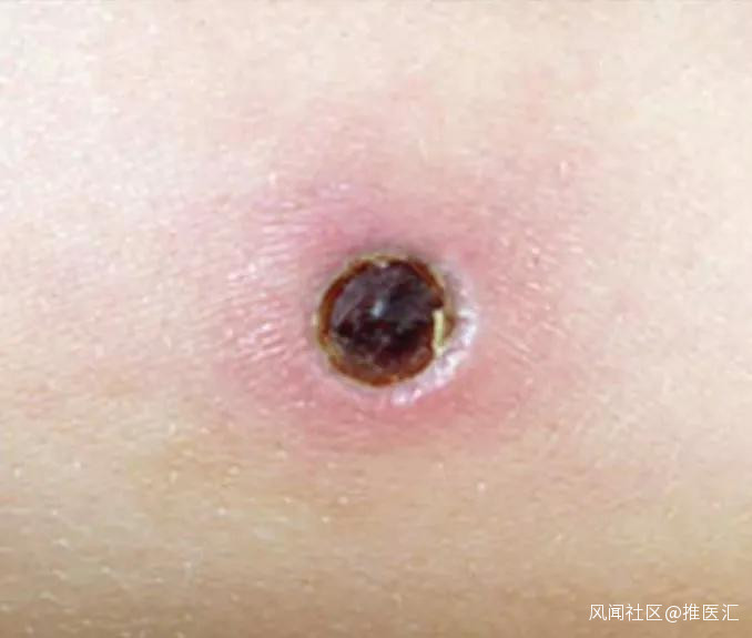 2010 年 9 月,男孩右前臂傷口仍未癒合,呈現為櫻桃大小、中央黑色壞死的潰瘍區,外周伴有鮮紅色的紅斑(圖 2)。男孩未感到疼痛,手臂也沒有腫脹或增粗,但潰瘍沒有癒合的趨勢。化驗示血細胞計數正常,肝酶等血清檢測未見異常。