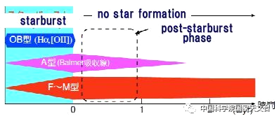 在E+A家族的經脈中:1)擁有超強的Balmer吸收脈絡,意味着A型成員的主導地位;沒有Ha和[OII]發射脈絡,OB型成員的缺席或沒落,星爆或恆星形成意外停止;2)擁有強大的Mg吸收脈絡,與K型成員的脈絡非常相似,因此,也稱之為“K+A”家族;而Mgb/Fe的比例關係顯示,在該家族中a元素有增豐現象。