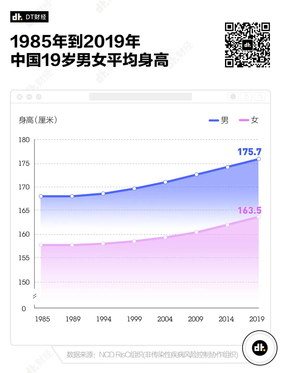 按照NCD RisC組織的統計,2019年中國19歲男女的平均身高已經分別達到了175.7釐米、163.5釐米,位列東亞第一。