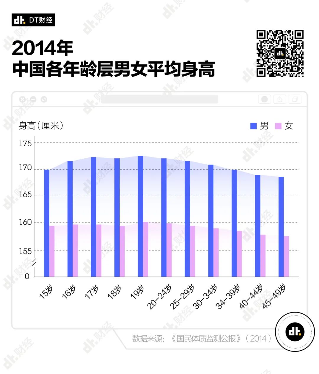 2014年的《國民體質監測公報》公佈了中國各年齡層男女的平均身高。在成年人組別中,年紀越小,身高越高。而16到19歲還在成長期的青少年,平均身高也超過了35歲+的中年人。