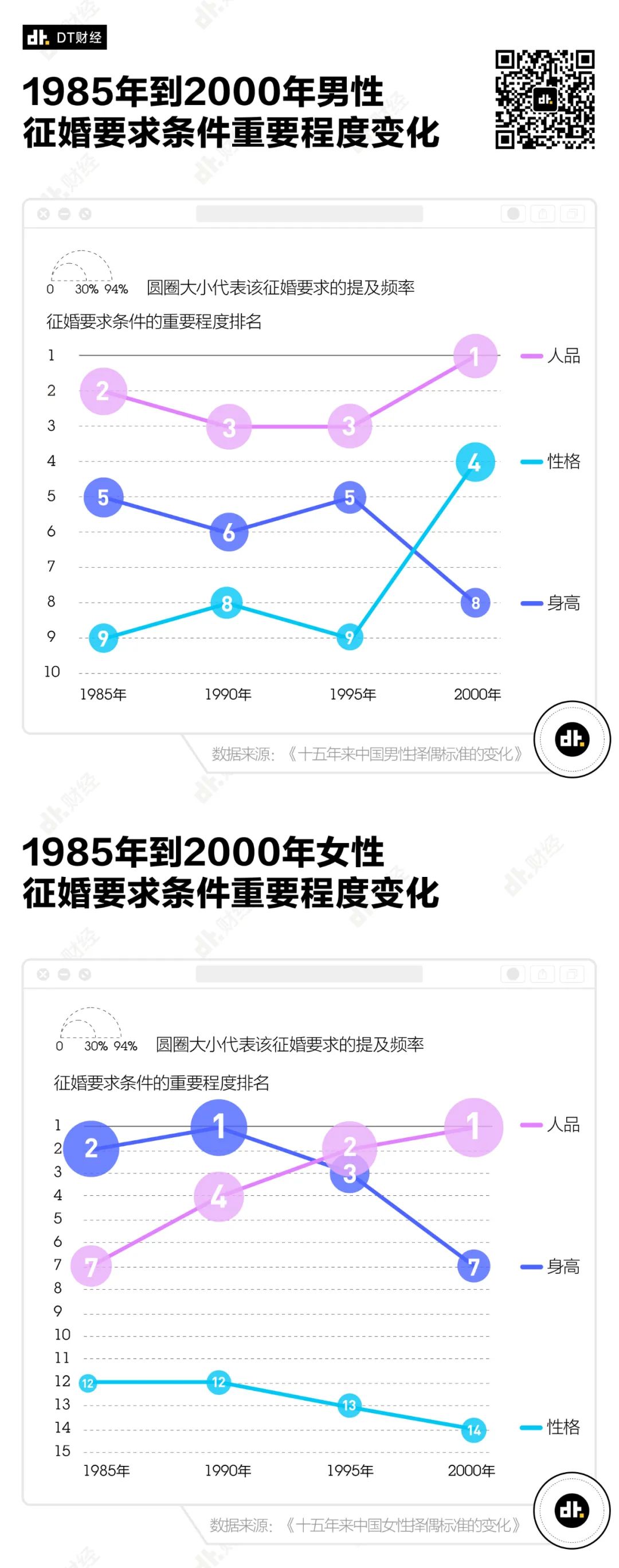 北京大學的錢怡銘教授團隊也研究了人們擇偶標準的變遷情況,該團隊從《中國婦女》雜誌中抽取了 1985年、1990年、1995年、2000年的幾百份徵婚啓事,統計了大家在徵婚啓事中提到的關鍵詞。