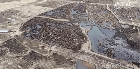 從記者拍攝的畫面中可以看到,原本肥沃的土地混雜着積水,變得坑坑窪窪,遭到非常嚴重的破壞。