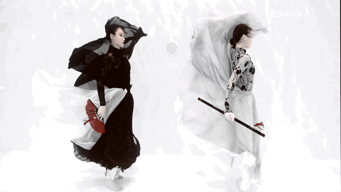 後有央視操刀,國家花樣游泳運動員表演的《翾》貢獻又一場國風盛宴。墨分五色,濃淡俱全,在白色背景的映襯下,兩名錶演者似墨在宣紙上破筆暈染,拂扇長蕭,落英飛動,起躍翻轉間兩儀相聚,共繪太極意象,一行一動都是中華元素的演繹與碰撞。