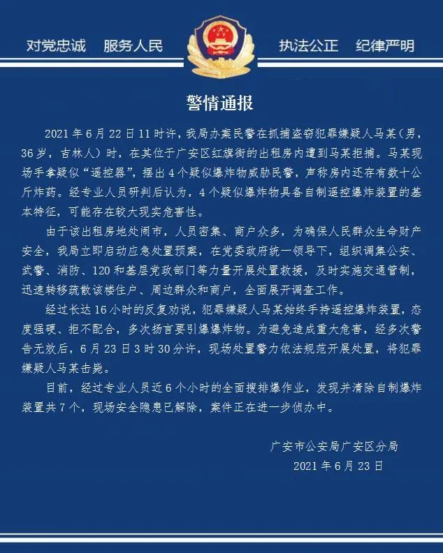 昨天,四川省廣安市公安局廣安區分局發佈警情通報:6月22日上午11點左右,辦案民警出動抓捕來自吉林的36歲盜竊犯罪嫌疑人馬某,警方進入馬某的出租屋後,遭到馬某拒捕。